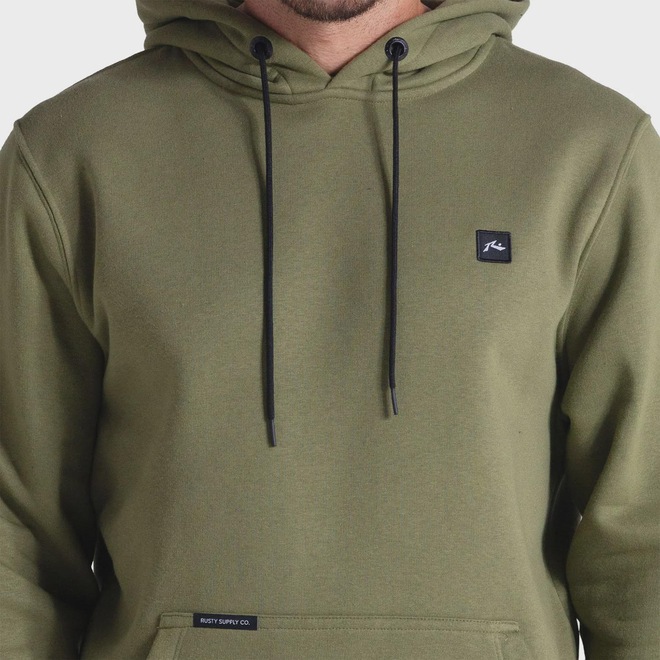 O Moletom Rusty Essential Green Olive é produzido com moletom flanelado 240G 65% Algodão e 35% Poliéster. Forro do capuz em tecido 1/2 Malha 100% Algodão. Bolso canguru, punho e barra com acabamento em ribana. O tradicional logo Rusty R Dot é apresentado em patch bordado no peito.