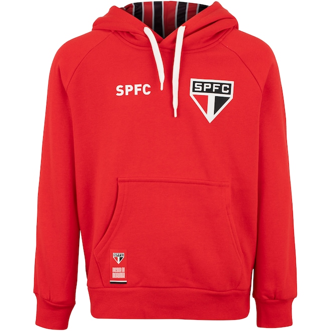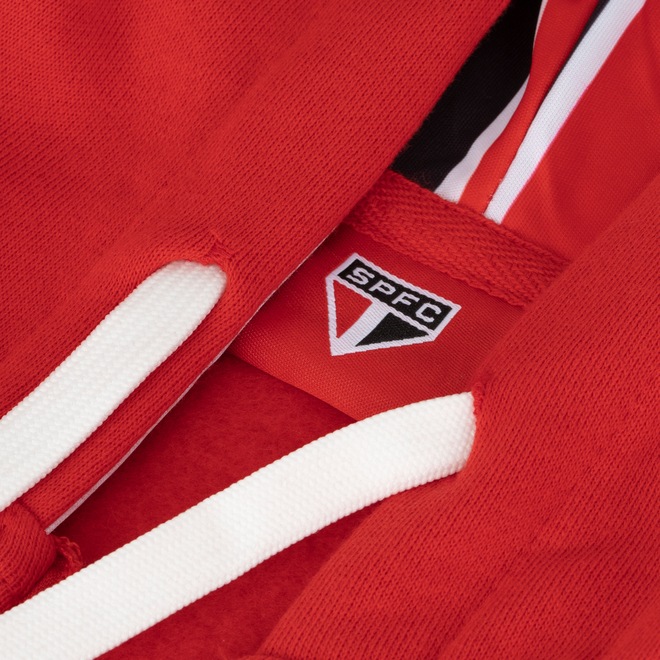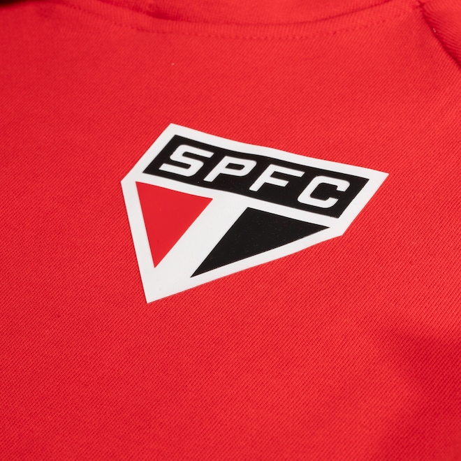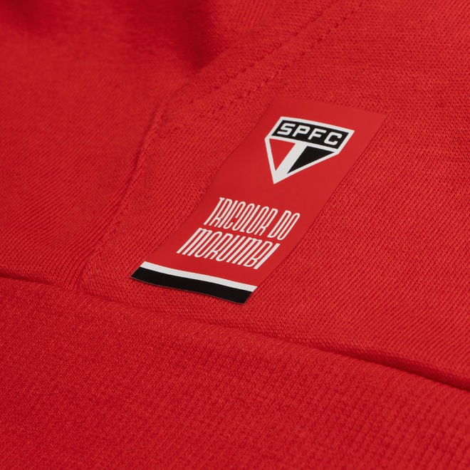 Conta ainda com o escudo e iniciais do clube, dois práticos bolsos frontais e o amor enraizado em cada detalhe pra vestir você, "tricolor paulista".