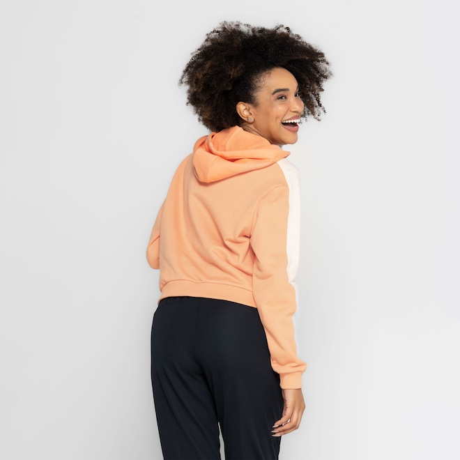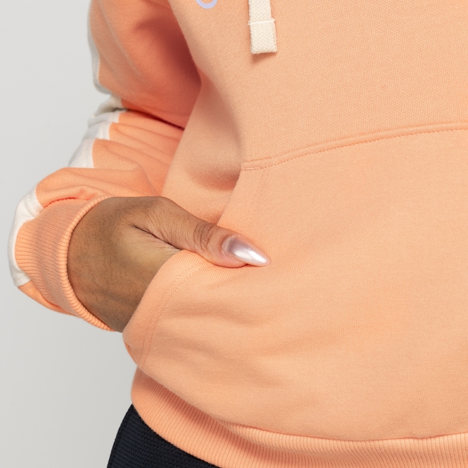 Possui a maciez da malha de algodão, barra e punhos canelados, além de capuz ajustado por cordão.