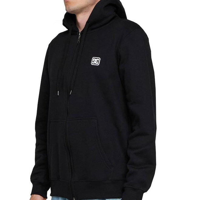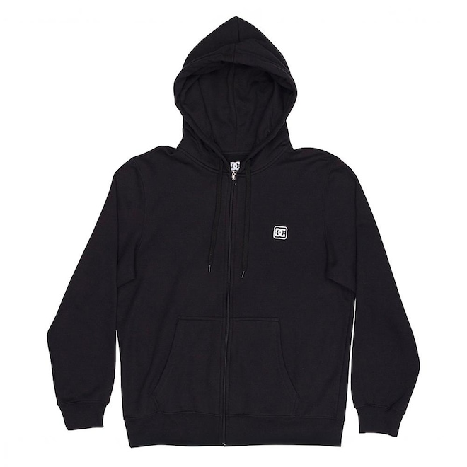Moletom Dc Shoes aberto 280g, etiqueta emborrachada aplicada no peito, cordão do capúz contrastante e etiquetas personalizadas.