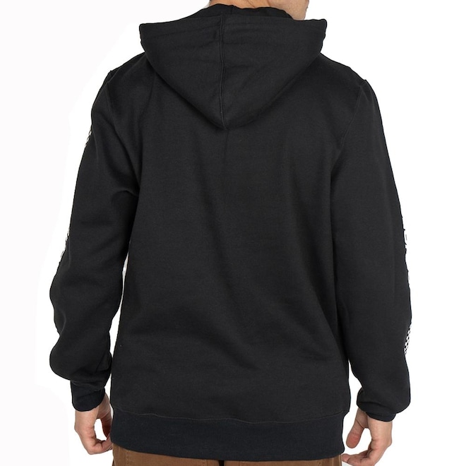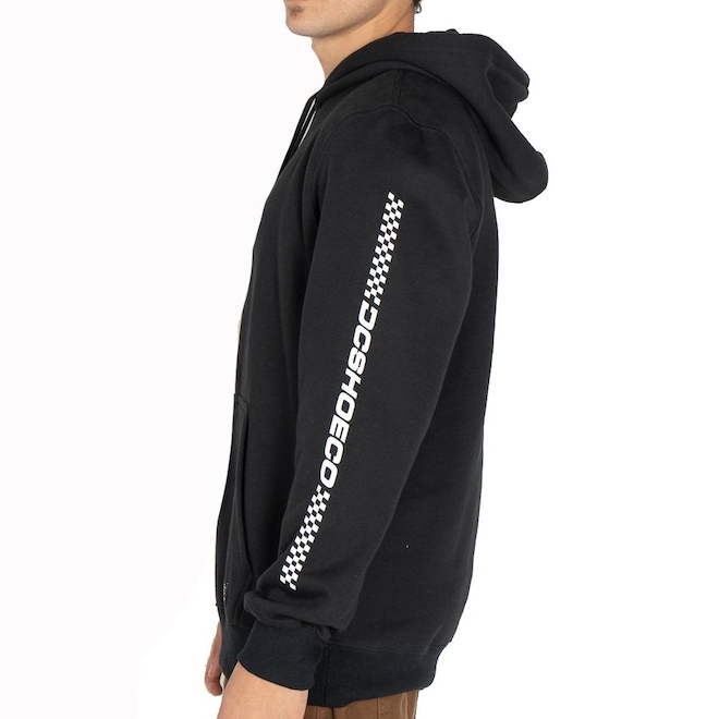 Moletom Dc Shoes fechado 270g, estampa frontal, estampa nas mangas, bolso canguru, cordão de capuz ajustável e etiquetas personalizadas.