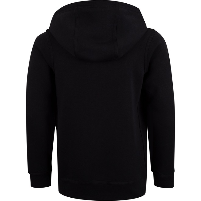 O blusão Nike infantil possui bolso canguru e capuz, com forro levemente flanelado.