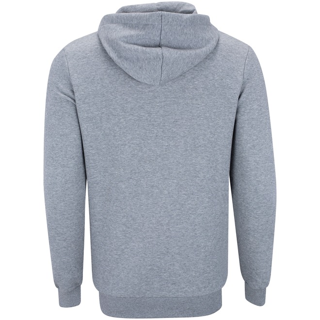 O blusão possui bolso canguru e forro levemente flanelado, com capuz de ajuste por cordão.