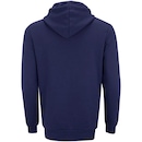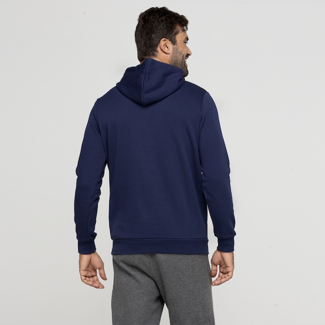 O blusão possui bolso canguru e forro levemente flanelado, com capuz de ajuste por cordão.