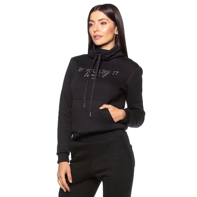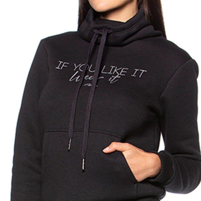 O Blusão Run More Wear - Feminino é confeccionado 53% em poliester e 47% em algodão, apresenta acabamentos com ribana.Possui gola alta com amarração e serigrafia na parte frontal escrita "If you like it, wear it" (tradução: Se você gosta, vista).