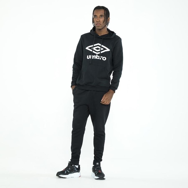 Blusão unissex confeccionado em moletom felpado de algodão com poliéster. Modelagem regular com capuz e manga longa. Possui cordão ajustável no capuz, bolso canguru frontal, punhos e barra em ribana e maxi logo Umbro em silk centralizado na parte frontal superior.ref: M12536