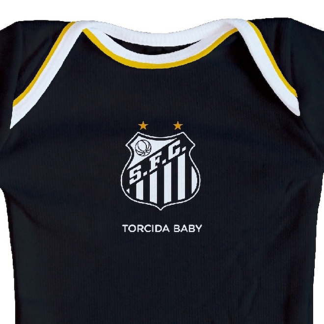 A peça na cor preta com detalhes em branco e amarelo, traz o escudo do Peixão na parte frontal , produzida em tecido bem leve e confortável para o pequeno torcedor.