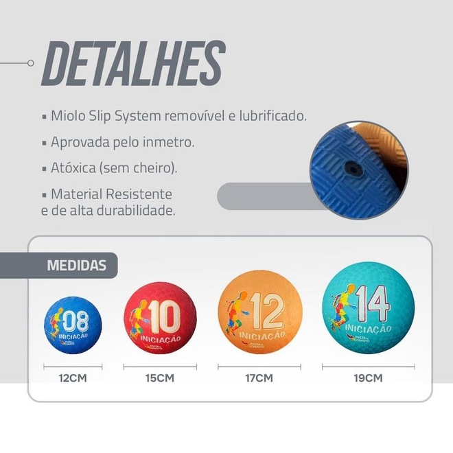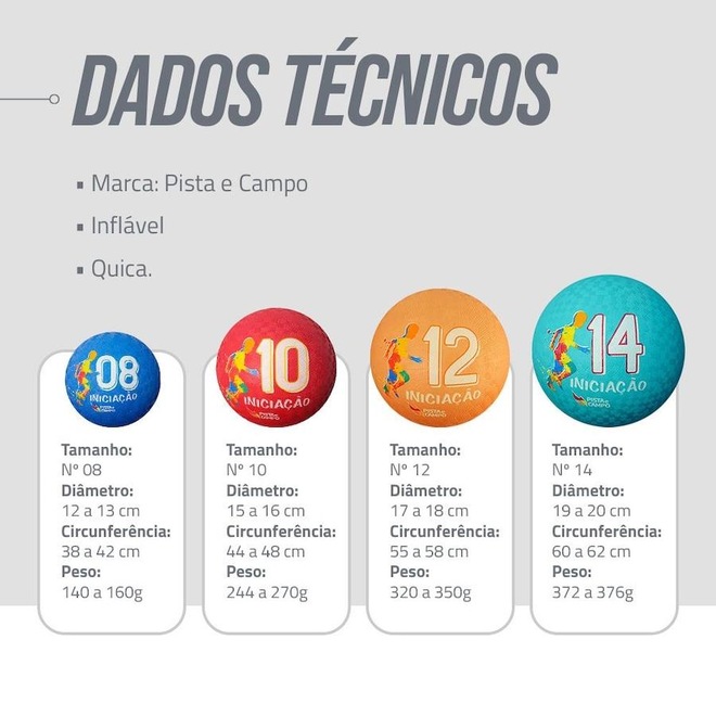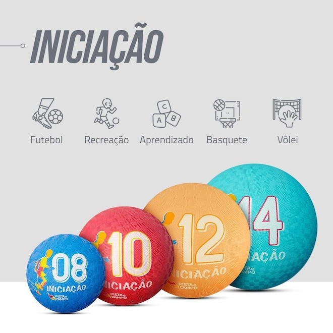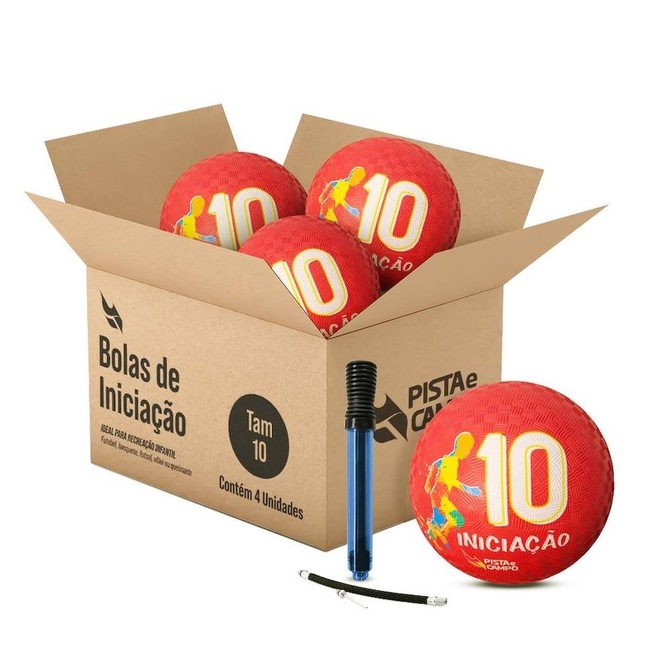 Bola de Iniciação Nº 10 Pista e Campo: Ideal para esportes e recreação como basquete, futsal e futebol. Melhora coordenação, atenção e agilidade. Durável, ótimo custo-benefício, emborrachada, atóxica, com válvula. Bolinha pequena indicada para crianças de 4 a 6 anos. DADOS TÉCNICOS ? Marca: Pista e Campo ? Acompanha bomba de inflar. ? Conteúdo: 04 bolas + 01 bomba de inflar. ? Diâmetro: 15 a 16cm. ? Circunferência: 44 a 48 cm. ? Peso: 244 a 270 gramas. ? Cor: . ? Texturizada ? Inflável AÇÕES E BENEFÍCIOS ? Muito utilizada em jogos de futebol, basquete, queimada e outras atividades. ? Material resistente e de alta durabilidade ? Possui válvula. ? Ideal para clínicas de reabilitação neurológica IMPORTANTE ? Miolo Slip System removível e lubrificado. ? As bolas não são enviadas infladas, para encher favor utilizar bomba com ponta fina.ref: M13CNO