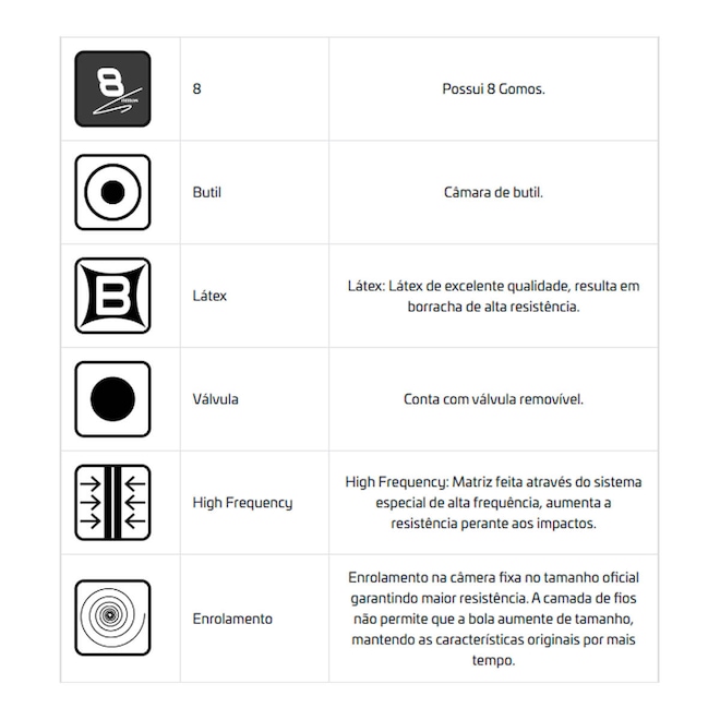 - Construção: Confeccionada em 8 gomos de borracha especial, que proporcionam maior resistência e durabilidade.