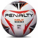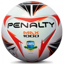 A Bola de Futsal Penalty Max 1000 X conta com um design inteiramente branco com detalhes em preto, vermelho e laranja.