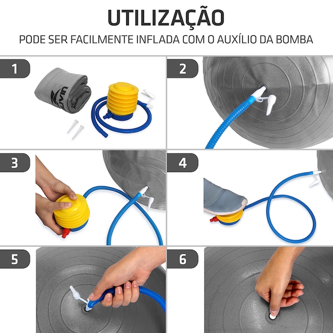 ACOMPANHA BOMBA: A Bola de Pilates da Muvin acompanha uma bomba para que ela seja inflada. É de fácil utilização e, por essa questão, também permite que seja esvaziada a qualquer momento caso seja necessário guardar em lugares menos espaçosos