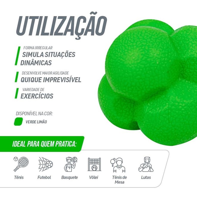 Bola de reação (reaction ball) da Pista e Campo. A bola é produzida por TPR (borracha termoplástica) para que ?quique? ao tocar o solo ou superfície atirada. Feita de borracha, ao ser arremessada ela percorre direções imprevistas, proporcionando, assim, aumento do reflexo. Use individualmente contra uma parede ou com seu time. ESPECIFICAÇÕES: - Material: Borracha termoplástica TPR maciça; - Cor: Verde limão. - Número de pontas: 6; - Peso: 125g; - Diâmetro: 7cm. - Além de proporcionar a melhoria dessas funções motoras, é um excelente acessório para gasto calórico de forma dinâmica.ref: M13ZPC