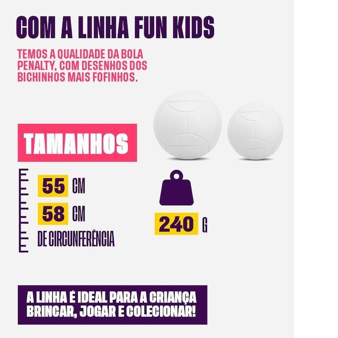Pensando na maneira de interagir as crianças e praticar atividades lúdicas, como jogos de recreação para divertir os participantes a Penalty desenvolveu a Bola Penalty Fun Kids XXII.