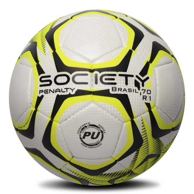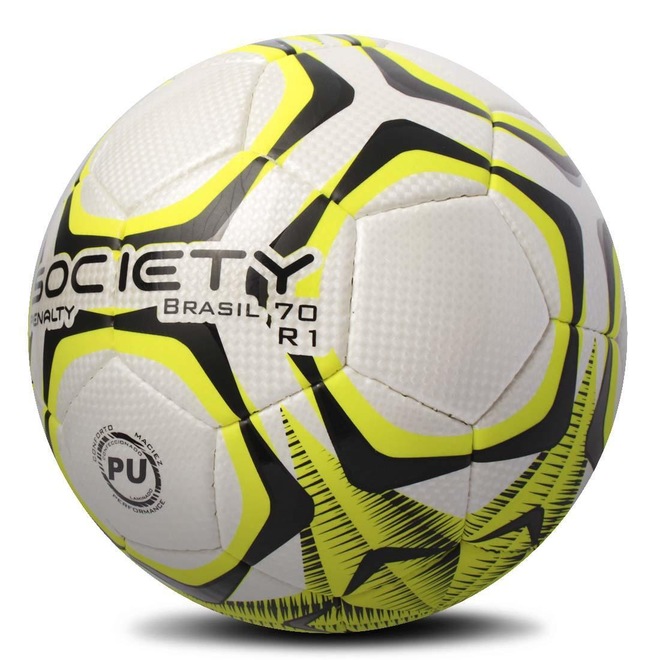 Bola Society Penalty Brasil 70 R1, câmara 6D consiste com um sistema inovador de balanceamento, composto por 6 discos posicionados simetricamente, proporcionando equilíbrio total para a bola.
