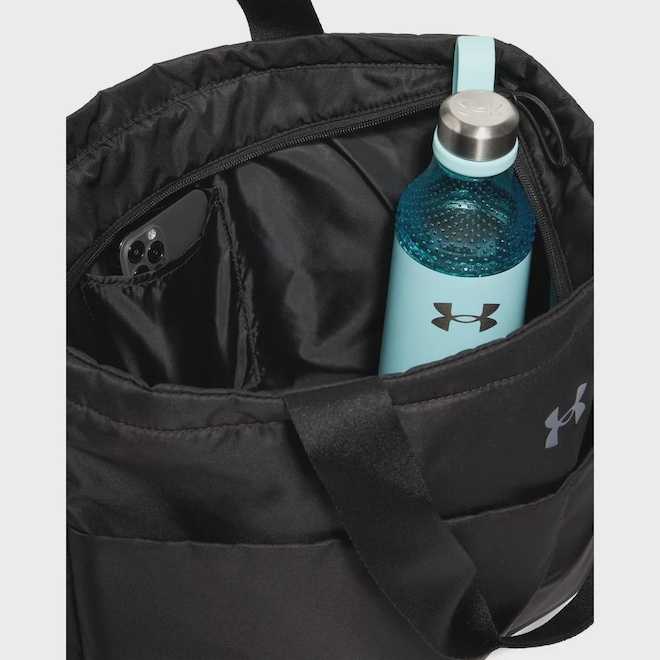 A tecnologia UA Storm impermeável mantém suas coisas secas. Grande compartimento principal com fechamento de zíper e bolso interno que comporta um telefone celular de até 6.12". Dois bolsos frontais acessíveis que comportam uma garrafa de água e proporcionam acesso fácil a seus itens essenciais. Puxador do zíper com elástico para cabelo.