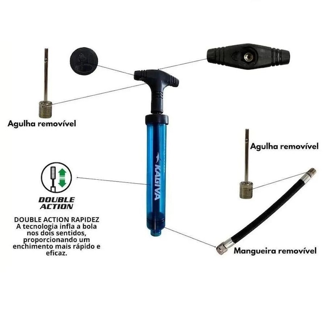 Bomba De Ar Kagiva Dupla Ação Produzido pela Kagiva, a Bomba é confeccionada com acrílico translúcido resistente, acompanha agulha e mangueira removível que garante o enchimento ideal de bolas. Dispõe também de uma bomba dupla ação que infla nos dois sentidos, tornando o enchimento muito mais rápido. Cuide dos detalhes, use Kagiva e comprove a qualidade!