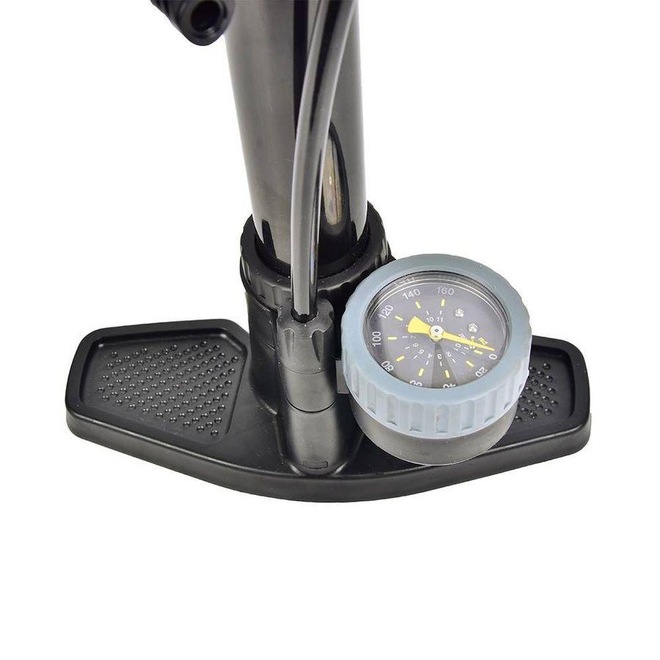 Detalhes: Sua estrutura é fabricada em ferro fundido, em sua base possui suporte para pés que facilitam o manuseio. Inflador tipo T, com medidor de pressão Manômetro, Diferentes bicos de enchimento
