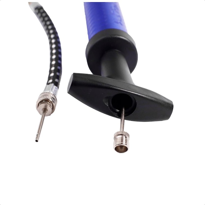 A bomba já vem com uma agulha de inflar padrão, armazenada de forma segura no corpo da bomba para evitar perdas. A agulha é compatível com a maioria dos tipos de válvulas de bolas esportivas.