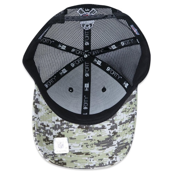 - Aba camuflada - Patch da bandeira dos Estados Unidos no lado direito - Patch NFL Salute To Service oficial na parte traseira - Flag New Era bordada no lado esquerdo