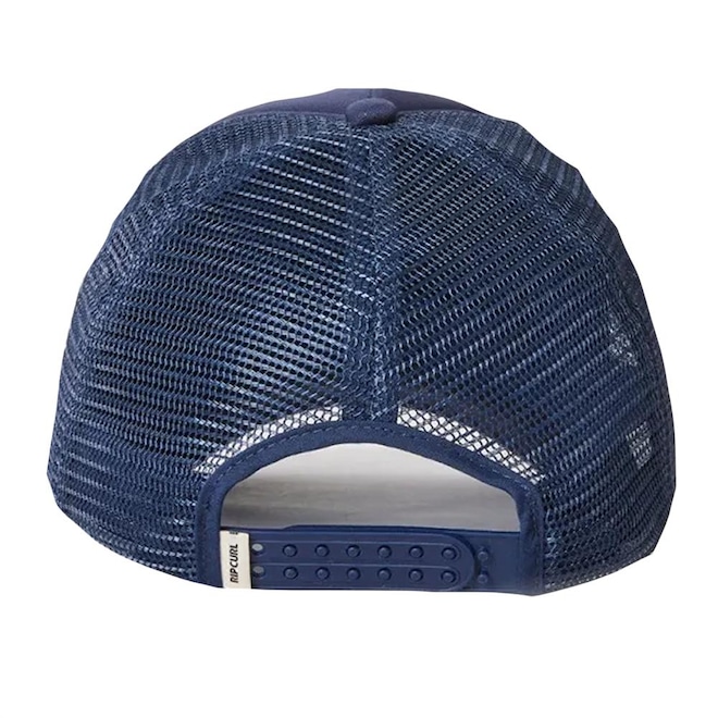 Boné Rip Curl com fechamento ajustável, aba ligeiramente curva, etiqueta bandeira de tecido e tela na parte traseira.