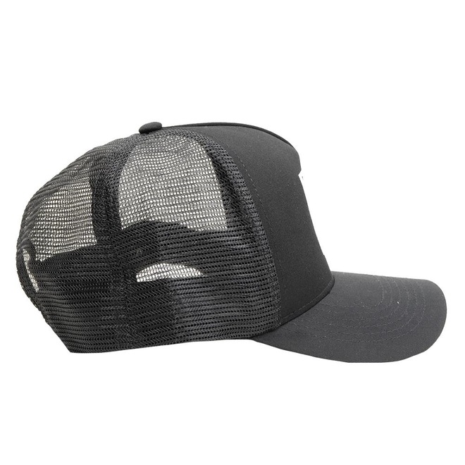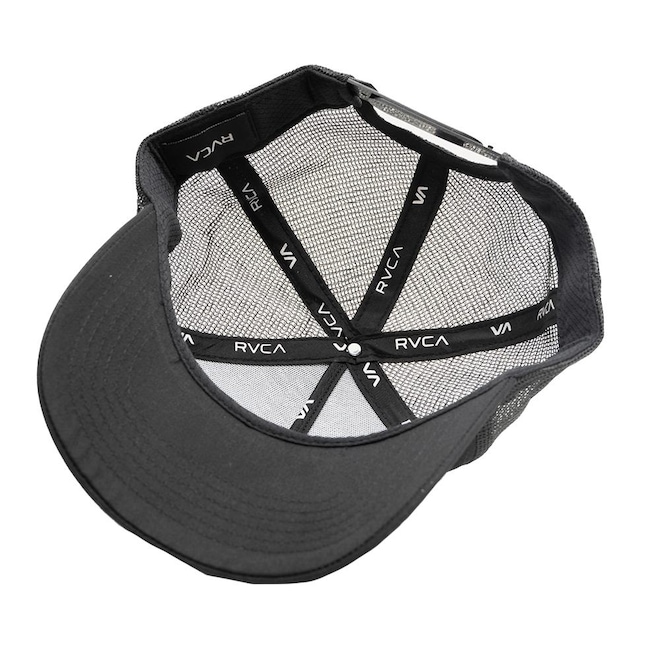 Boné Rvca Trucker estruturado com sarja e telinha traseira, silk frontal, regulador snapback plástico e etiquetas personalizadas.