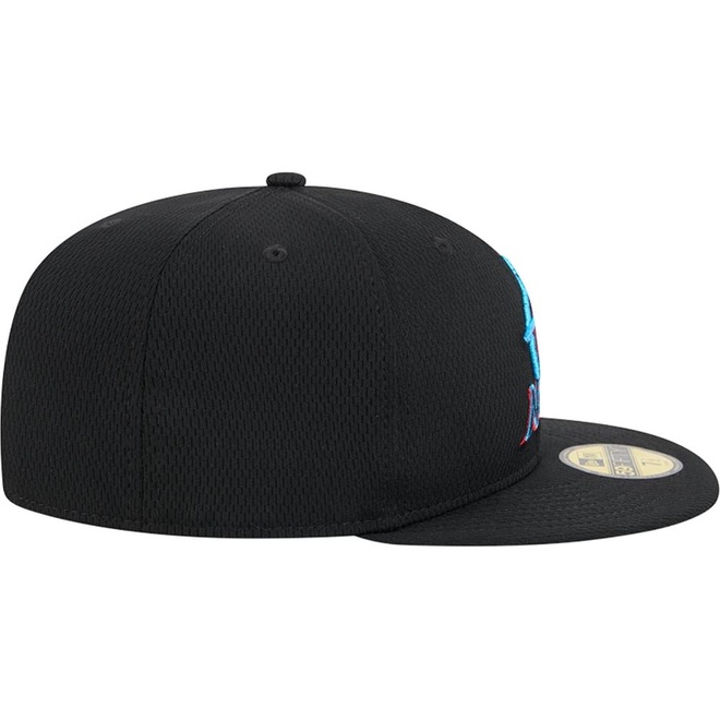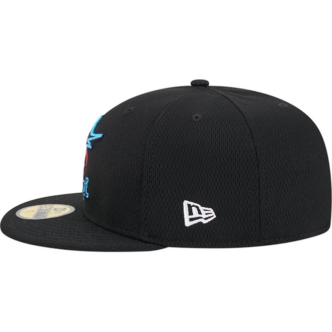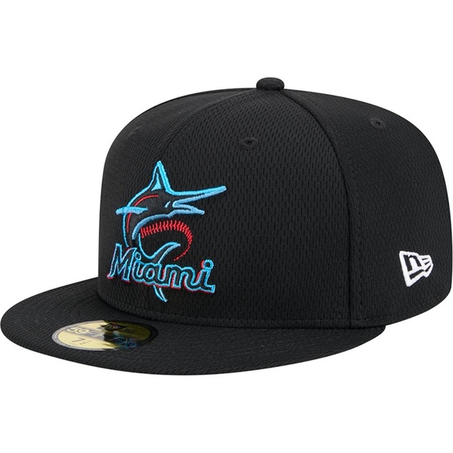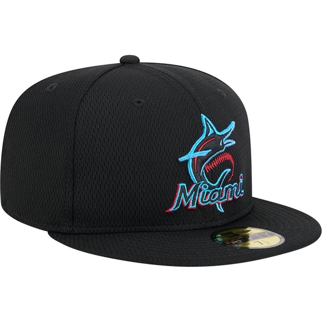 Este boné apresenta um logotipo alternativo do Miami Marlins bordado nos painéis frontais com um logotipo MLB Batterman na parte traseira. Detalhes adicionais incluem um tecido em mesh, uma contra-aba em cor contrastante e o logotipo da equipe na parte inferior da aba.
