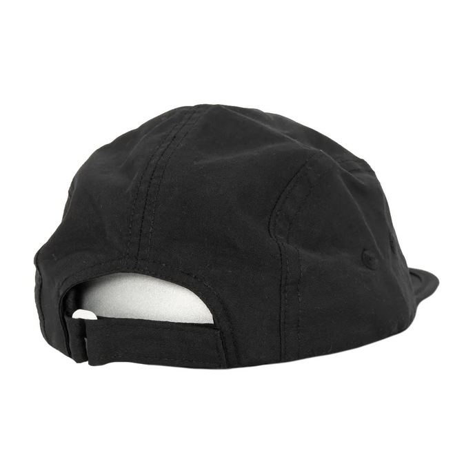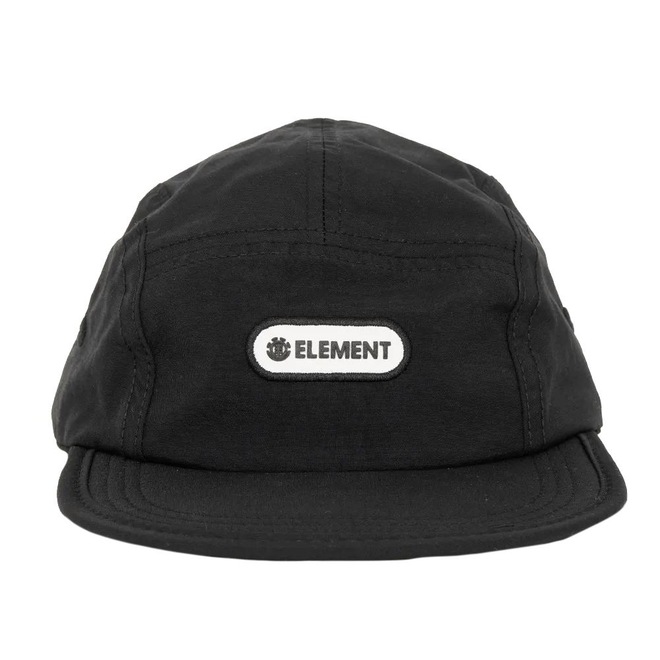 Boné Element feito em modelagem five panel, aba reta flexível, acabamento em viés, patch frontal aplicado no centro, parte traseira com strapback, fechamento em velcro e etiquetas personalizadas.