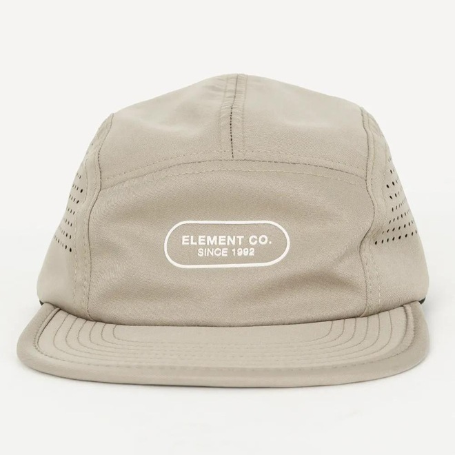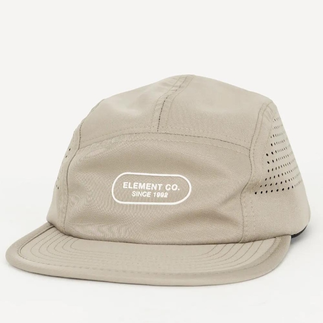Boné Element feito em modelagem five panel, aba reta flexível, acabamento em viés, estampa frontal em alto relevo, lateral furada a laser até a metade, parte traseira com strapback e ajustador e etiquetas personalizadas.