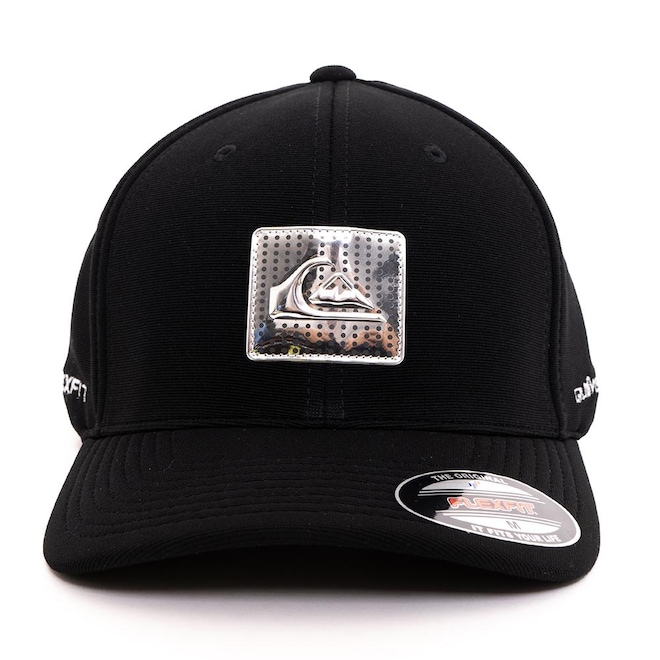 Boné QuikSilver feito em modelagem 6 painel Flexfit, faixa anti suor por toda a circunferência interna, Patch da logo em soldagem sônica centralizado no painel frontal, aba interna lisa, bordado FLEXFIT aplicado ao longo da lateral direita e etiqueta localizada na barra traseira.