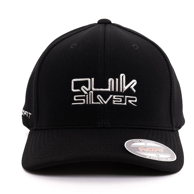 Boné QuikSilver feito em 6painel Flexfit, faixa anti suor por toda a circunferência interna, assinatura cromada soldada centralizada no painel frontal, aba interna lisa, bordado FLEXFIT aplicado ao longo da lateral direita e etiqueta localizada na barra traseira.