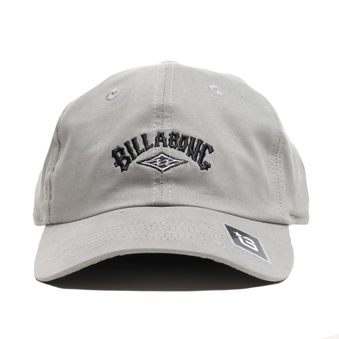 Boné Billabong desestruturado feito em modelagem 5Panels, tecido em sarja, possui aba curva e bordado frontal personalizado, ajuste com fivela metálica e etiquetas personalizadas.