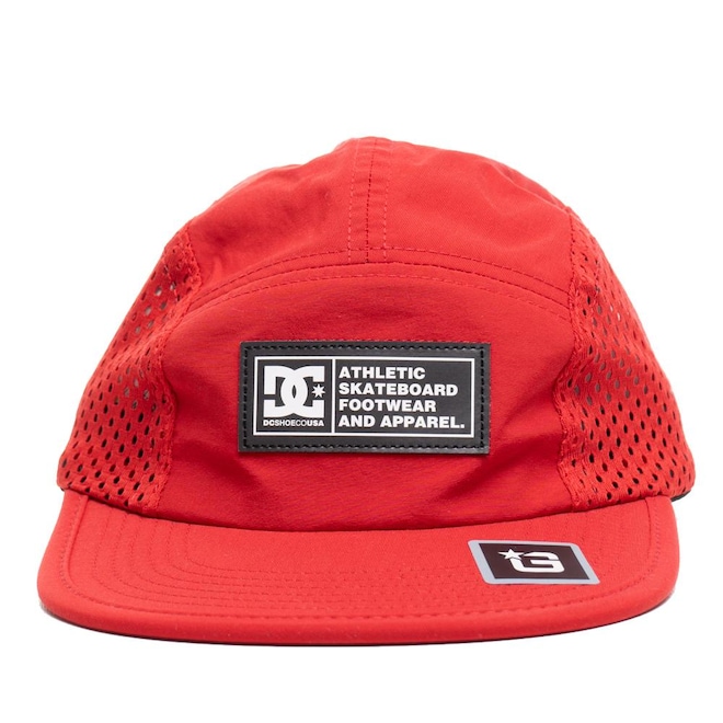 Boné Dc Shoes five panel, desestruturado, tecido poliamida, aba reta, strapback com fecho tic-tac, silk relevo no painel frontal e na lateral esquerda.