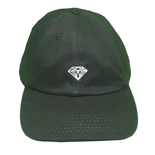 Boné Diamond tamanho único, estruturado, bordado frontal, aba curva, fechamento em strapback e etiquetas personalizadas.