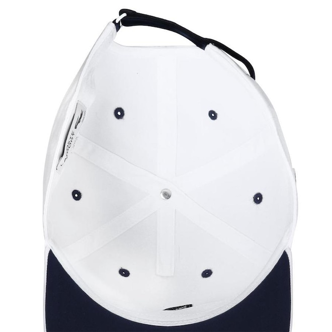 - Detalhamento Boné: Boné não estruturado na cor branca, possui 6 gomos com ilhóses em cor contrastante que ajudam na respirabilidade, logo Novak Djokovic aplicado na parte frontal na cor marinho e logo Lacoste em silicone aplicado do lado direito, fechamento em velcro, dimensões: 56cm largura X16cm profundidade;