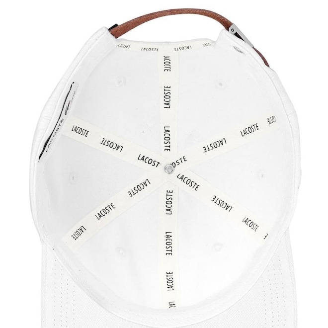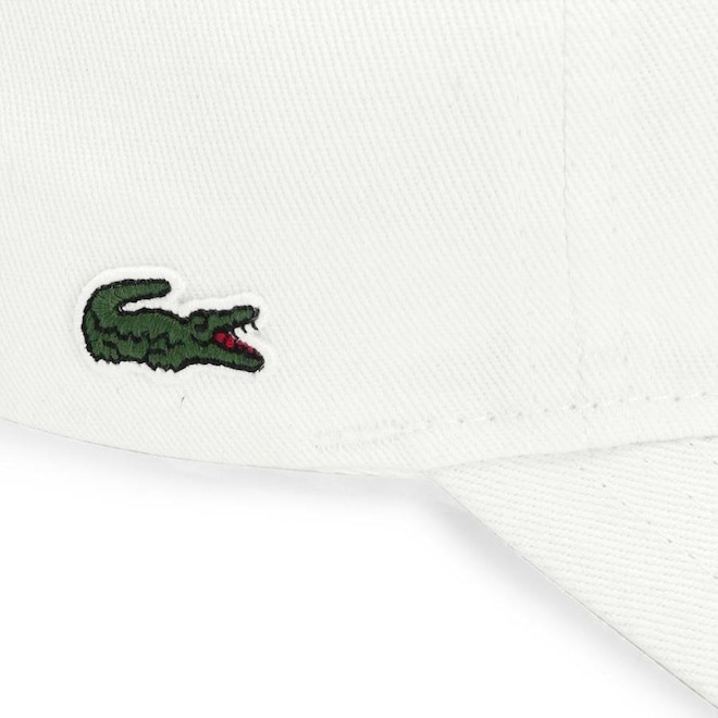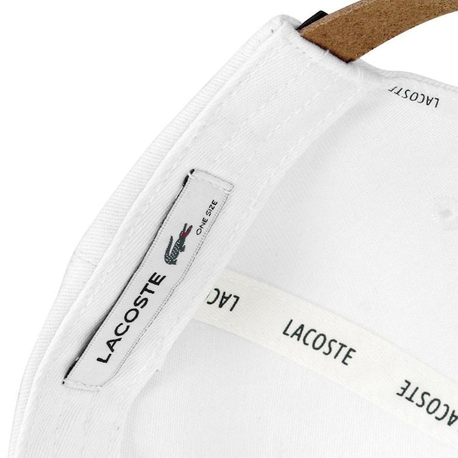 - Detalhamento: Boné com 6 gomos não estruturado e ilhoses para maior respirabilidade, logo Lacoste bordado aplicado do lado direito, fecho em tira em cor contrastante e fivela metalizada;