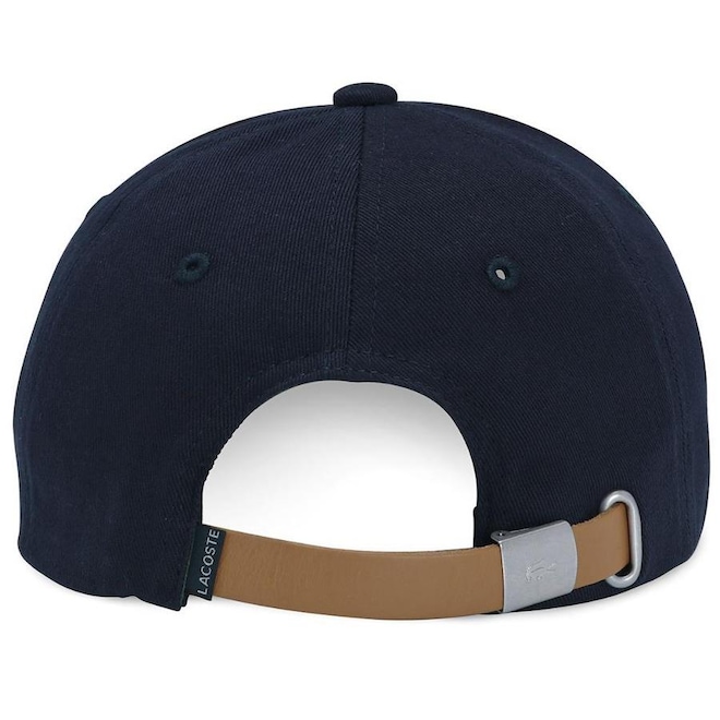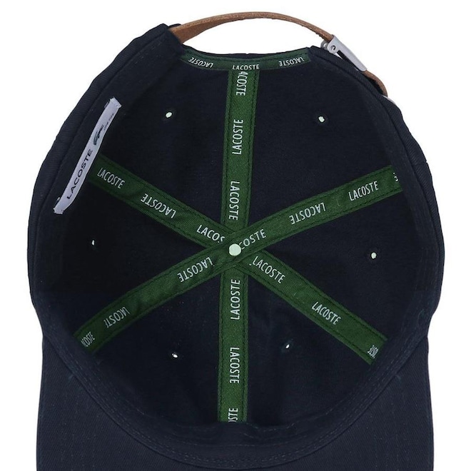 - Detalhamento: Boné com 6 gomos não estruturado e ilhoses para maior respirabilidade, logo Lacoste bordado aplicado do lado direito, fecho em tira em cor contrastante e fivela metalizada;