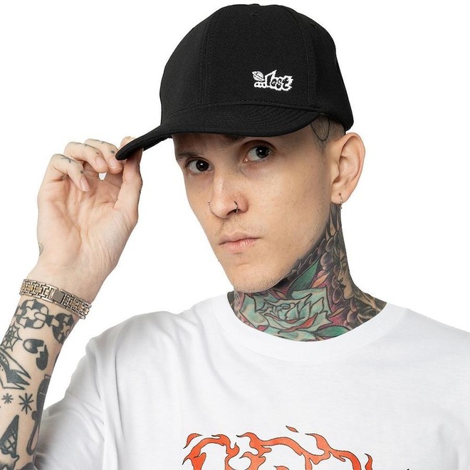 Boné Lost feito em material não natural, logo frontal e etiquetas personalizadas.