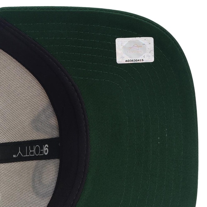 - Detalhamento: Tamanho único, com seis gomos, sendo o dois frontais estruturado e os demais em tecido maleável com pontos de ventilação para maior respirabilidade. Apresenta o logo frontal AO (Australian Open) bordado em alto relevo, garantindo autenticidade, e o logo da New Era bordado na lateral, reforçando o design icônico da marca. Possui aba curva, flexível, em tom verde mais escuro. Fecho traseiro ajustável que se adapta perfeitamente, oferecendo conforto e um visual moderno dentro e fora das quadras. Detalhe exclusivo com a escrita Australian Open bordada na parte traseira;