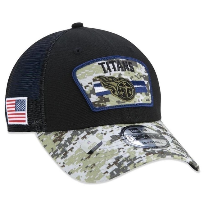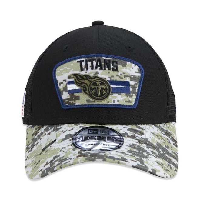 Boné New Era Tennessee Titans 940 NFL21 Salute to Service Boné Aberto com regulagem, 9Forty Cor: '' / '' (Camuflado) / '' Marinho Composição; 100% Poliéster Logo frontal bordado Bordados nas lateral e traseira TennesseeTitans Importado e Licenciado Oficialmente pela NFLref: M0YWOB