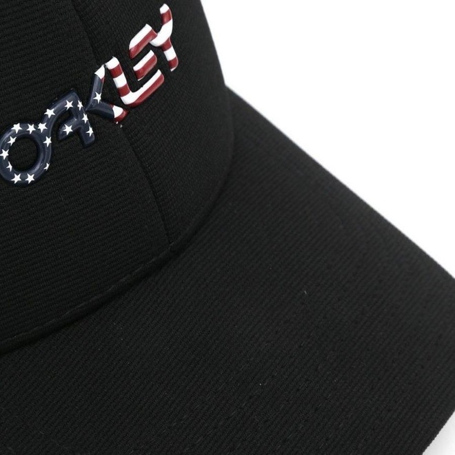 Boné Oakley com aba curva, logo Mark II frontal e bordado traseiro, faixa acolchoada para controle de suor na testa e ilhoses para ventilação.