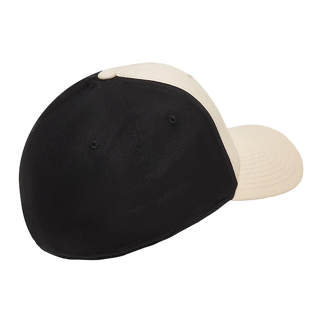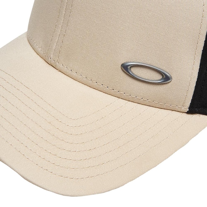 Boné Oakley feito em seis painéis com ilhós bordados, logotipo metálico da Oakley em forma de elipse no lado esquerdo da frente, aba curva e ajuste fixo.