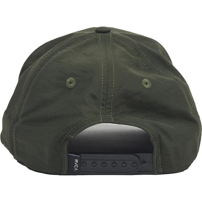 Boné RVCA aba curva desestruturado snapback com fecho plástico, tecido em poliamida com bordado frontal e etiqueta personalizada atrás.