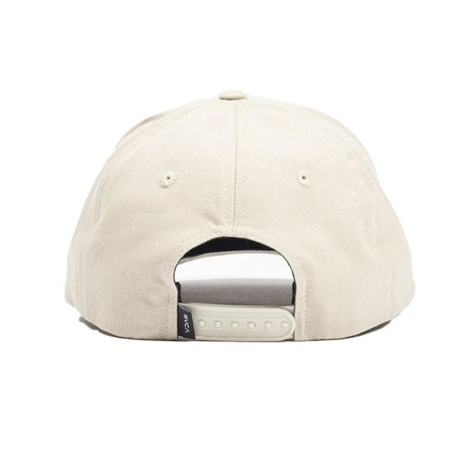 Boné RVCA em sarja de algodão, aba curva, estruturado, com aplique de material não natural frontal, regulador snapback plástico e etiqueta personalizada atrás.