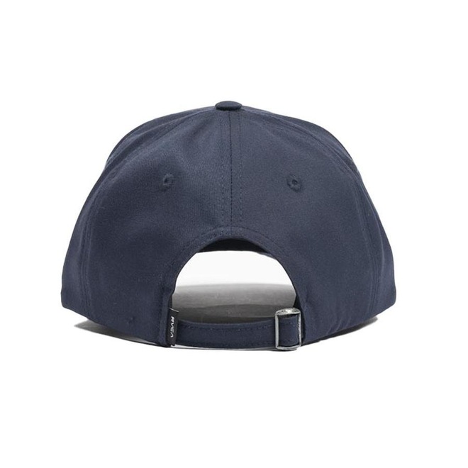 Boné RVCA em tecido de poliéster com algodão, aba curva, estruturado, etiqueta frontal aplicada, com regulador metálico e etiqueta personalizada atrás.