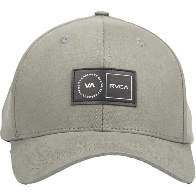 Boné RVCA aba curva estruturado strapback com fivela metálica em sarja, com etiqueta frontal aplicada e etiquetas personaliada atrás.