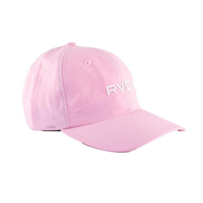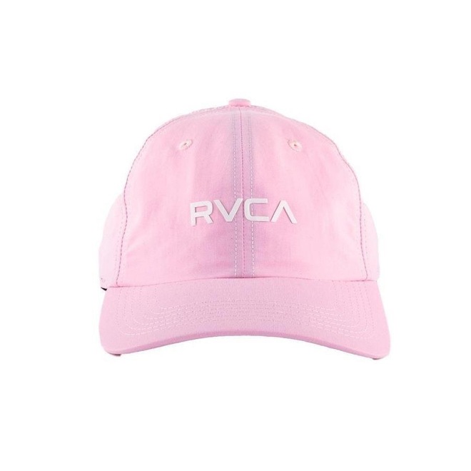 Boné aba curva desestruturado, tecido de poliamida, logo RVCA estampado na frente, regulador tic tac e etiqueta personalizada atrás.