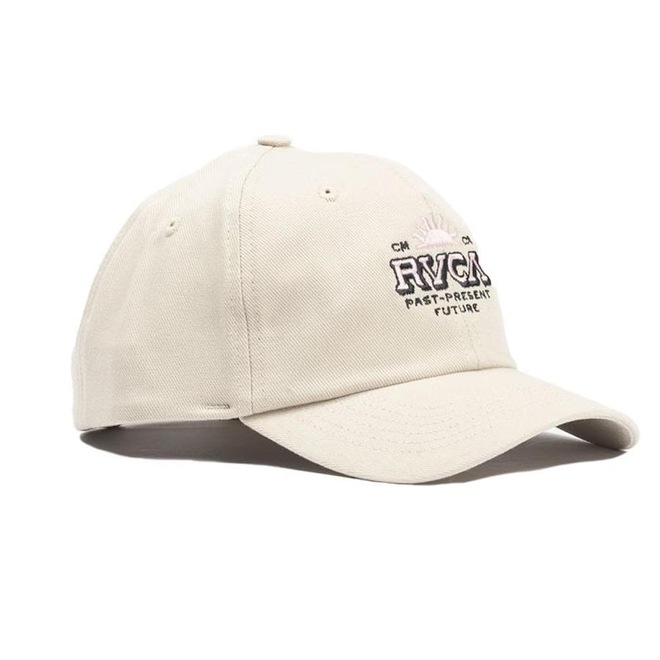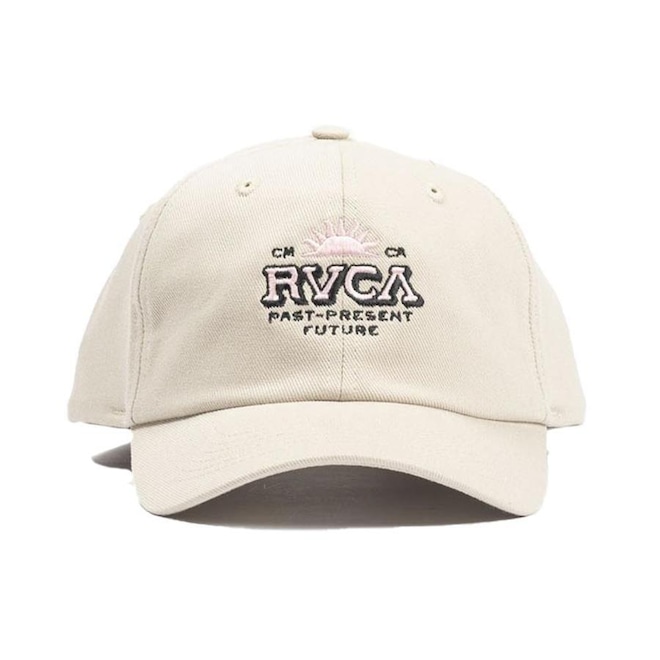 Boné RVCA em sarja de algodão, aba curva, estruturado, bordado arte RVCA frontal, regulador em snapback plástico e etiqueta personalizada atrás.