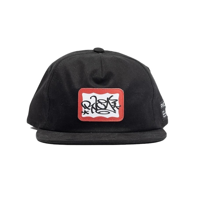 Boné RVCA em sarja de algodão com aplique alto relevo frontal, aba reta desestruturado, etiqueta personalizada na lateral, regulador snapback plástico e etiqueta personalizada atrás.