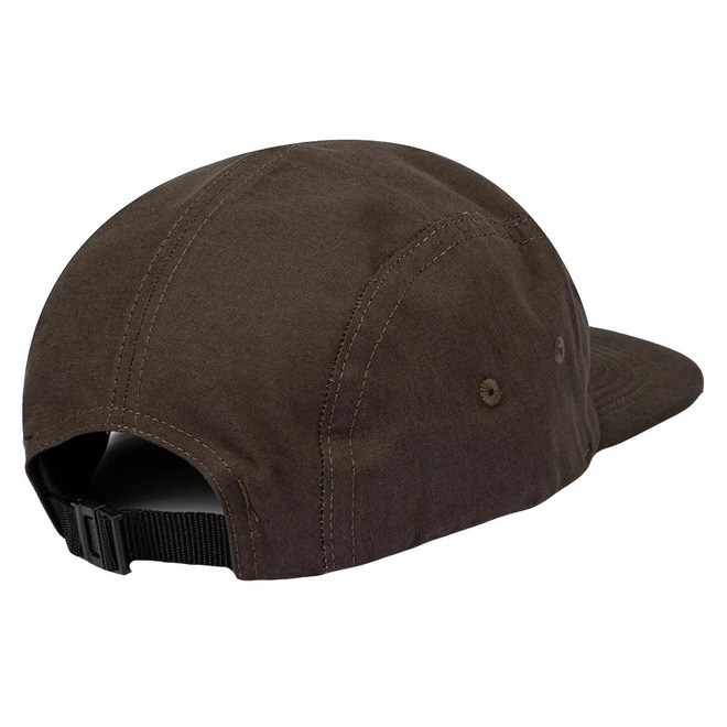 Boné Volcom feito em modelagem 5 panel, desestruturado, bordado sobretom frontal, ajuste traseiro com regulador e etiquetas personalizadas.