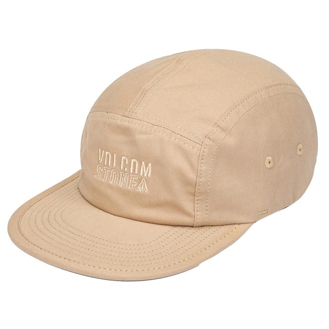 Boné Volcom feito em modelagem 5 panel, desestruturado, bordado sobretom frontal, ajuste traseiro com regulador e etiquetas personalizadas.